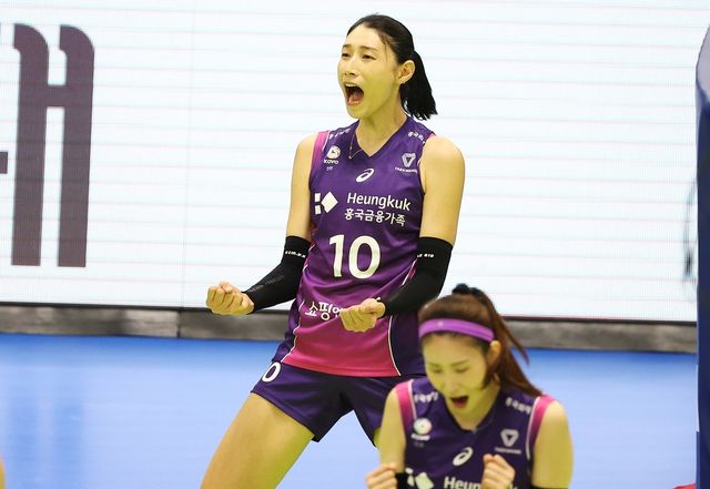 김연경이 지난달 18일 경기도 수원실내체육관에서 열린 프로배구 V리그 여자부 현대건설 힐스테이트와 흥국생명 핑크스파이더스의 경기에서 득점에 성공한 뒤 기뻐하고 있다. / 연합뉴스