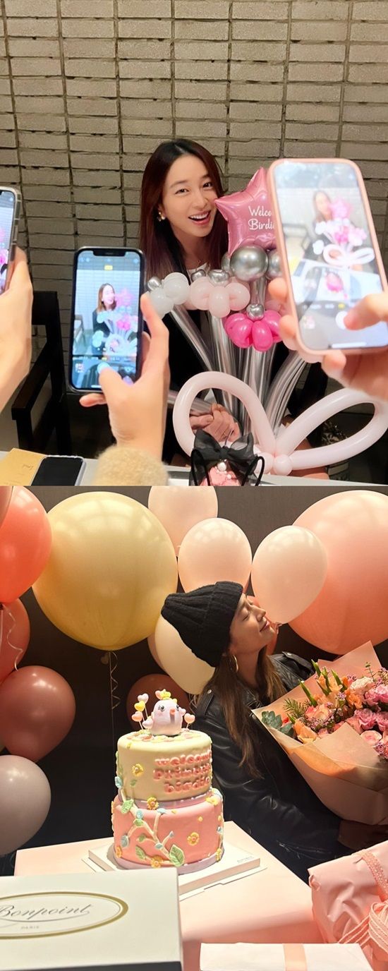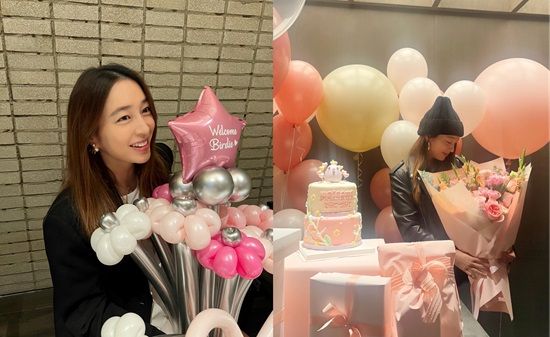 공개된 사진 속 이민정은 분홍색 케이크와 꽃다발, 풍선들로 화려하게 장식 된 곳에서 축하를 받고 있다.