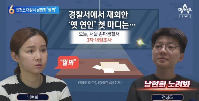 채널A 뉴스TOP 10에 따르면 남현희는 경찰서에서 재회한 옛 연인 전청조가 자신을 노려보자 "뭘 봐"라며 첫 마디를 건넨 것으로 알려졌다.