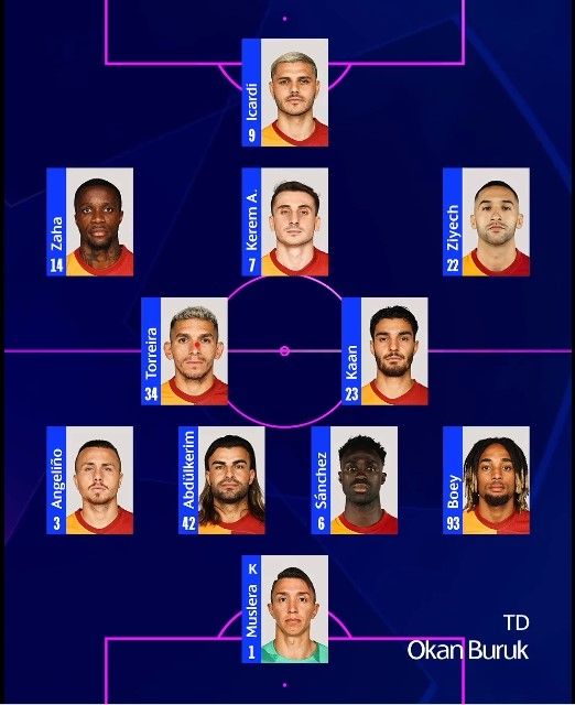 원정팀 갈라타사라이도 4-2-3-1 전형으로 맞섰다. 페르난도 무슬레라 골키퍼를 비롯해 앙헬리뇨, 압둘케림 바르닥치, 다빈손 산체스, 사샤 보이가 수비를 구축했다. 카안 아이한과 루카스 토레이라가 수비를 보호했고 윌프레드 자하, 케렘 아크튀르코글루, 하킴 지예흐가 2선, 최전방에 마우로 이카르디가 득점을 노렸다.