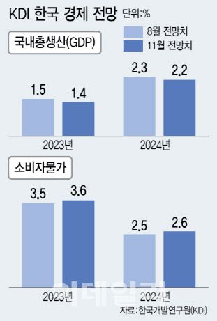 올해 경제성장률은 1.4%로 전망했다. 이는 지난 8월 전망치(1.5%)보다 0.1%포인트 하향 조정된 수치다. 정규철 KDI 경제전망실장은 “8월에 생각했던 것보다 고금리 기조가 장기화되고 시장금리가 많이 올라간 부분이 우리 경제 회복세를 조금 더 늦추는 상황이 올해와 내년까지 이어질 것”이라고 분석했다.