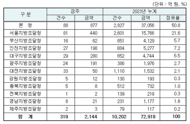 지역별 발주량을 보면 대전광역시 소재 본청 877억 원, 서울지방청 440억 원 등 2개청(1,317억 원)이 전체 금액(2,144억 원)의 61.4%를 차지하고 있으며, 인천 등 나머지 10개 지방청 827억 원이 각각 집행될 예정이다.