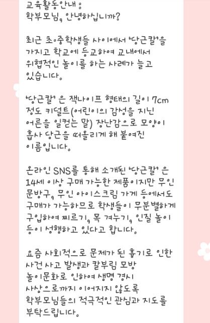 대구시교육청은 공문에서 “사회적으로 문제가 된 흉기로 인한 사건·사고 발생과 칼부림 모방 놀이문화로 인해 생명 경시 사상으로까지 이어지지 않도록 학부모들의 관심과 지도가 필요하다”고 안내했다.