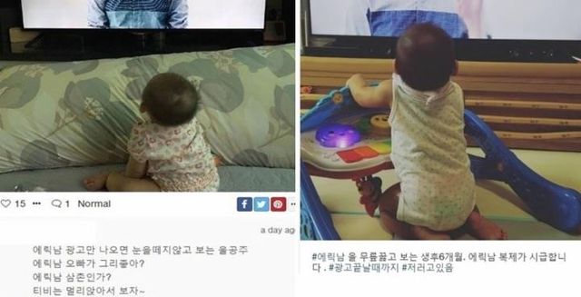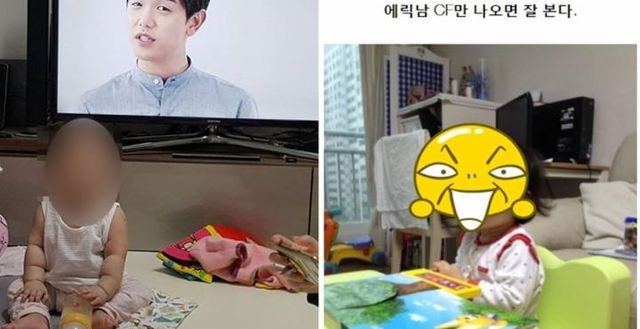 커뮤니티에 개시된 글에는 아기들이 TV속의 에릭남 광고에 집중하는 모습이 담겨 있다.