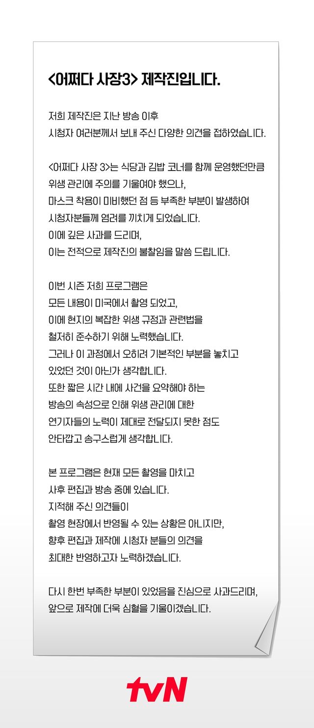 제작진 측은 "식당과 김밥 코너를 함께 운영했던만큼 위생 관리에 주의를 기울여야 했으나, 마스크 착용이 미비했던 점 등 부족한 부분이 발생하여 시청자분들께 염려를 끼치게 되었다"라며 "이에 깊은 사과를 드리며, 이는 전적으로 제작진의 불찰임을 말씀 드린다"라고 사과했다.
