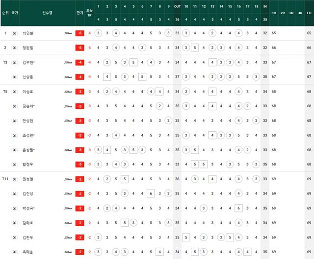 1.최민철 -6, 2.정한밀 -5, T3.김우현-신상훈 -4, T5.이성호-김승혁-전성현-조성민-윤상필-함정우 -3, T11.권성열-박성국-김찬우-옥태훈 -2, T17.이동민-박준홍-고군택 -1, T25.이원준-김한별-허인회-최진호-정찬민-김동민-강경남 E, T37.백석현-이수민-한승수 +1, T42.김홍택-이재경-황중곤-이정환 +2, T50.장희민-배용준-박은신-박상현 +3, T55.이준석 +4, 58.전가람 +5