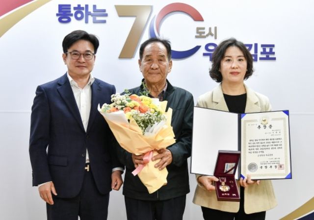 | ▲ 김병수 김포시장이 9일 참전유공자 故이종원 선생 자녀(이갑호)에게 화랑무공훈장을 전수했다. 좌측으로부터 김병수 김포시장, 이갑호님, 이갑호님의 딸. |