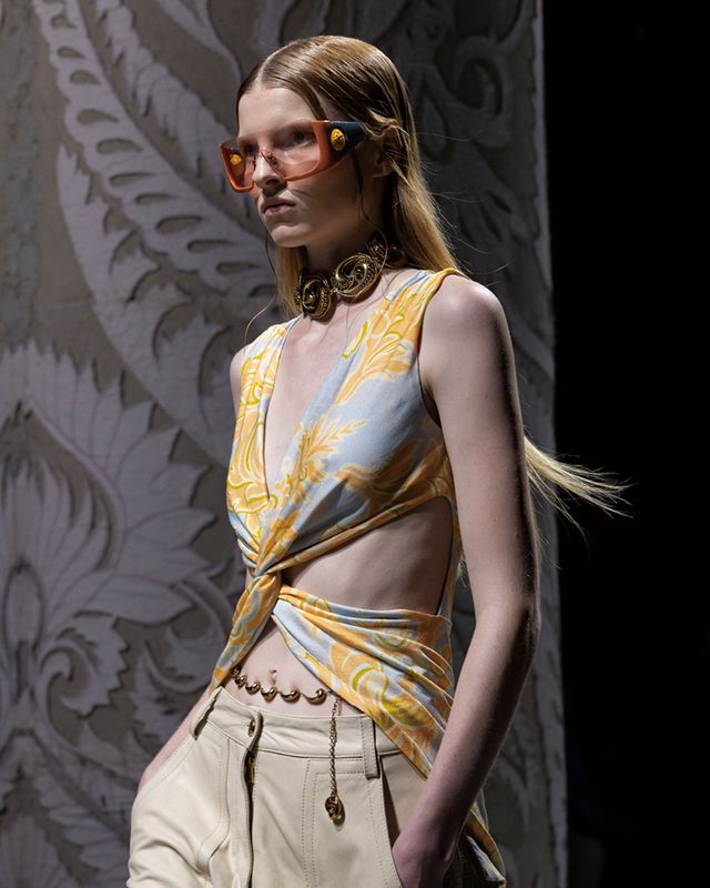 미지의 세계를 통해 꿈꾸는 자유에 대해 이야기한 마르코 드 빈센조의 런웨이에는 신비로운 섬 모티프의 일러스트레이션을 과감하게 새겨 넣거나 폴리네시아식으로 땋은 머리 패브릭 장식을 부츠의 앞코까지 늘어뜨리는 등 시선을 붙드는 참신한 룩으로 채워졌다. 유서 깊은 히스토리를 지닌 에트로의 전통적 코드를 유쾌하고 위트 넘치는 감각으로 재해석한 컬렉션은 웨어러블한 재킷과 니트, 관능적인 실루엣의 스커트 위에 과감한 해체 패턴과 컷아웃을 더해 다채로운 면면이 어우러진 모습. 이는 어떤 것도 자유롭게 조합하고 모든 것이 허용되는