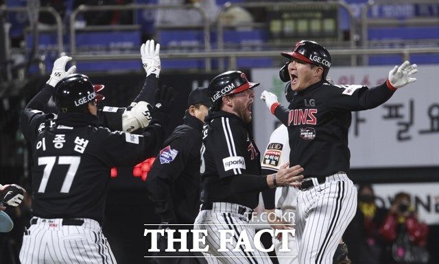 재역전의 기쁨을 온 몸으로 표현하는 오지환과 LG 선수들./수언=뉴시스