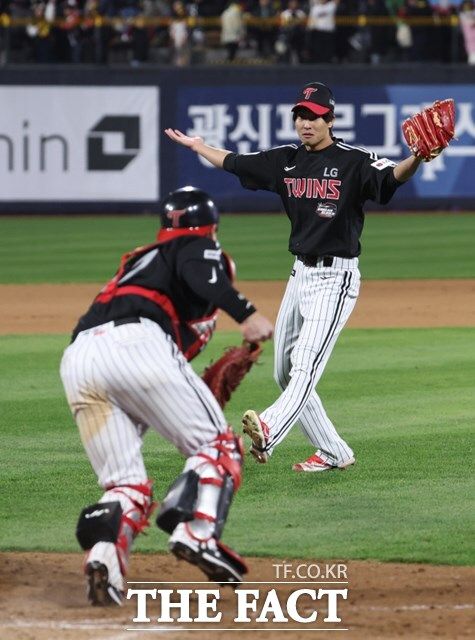 8-7 '케네디 스코어'로 3차전을 마무리한 LG 이정용과 박동원 배터리./수원=뉴시스