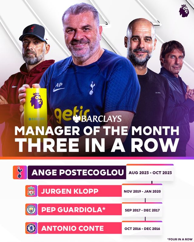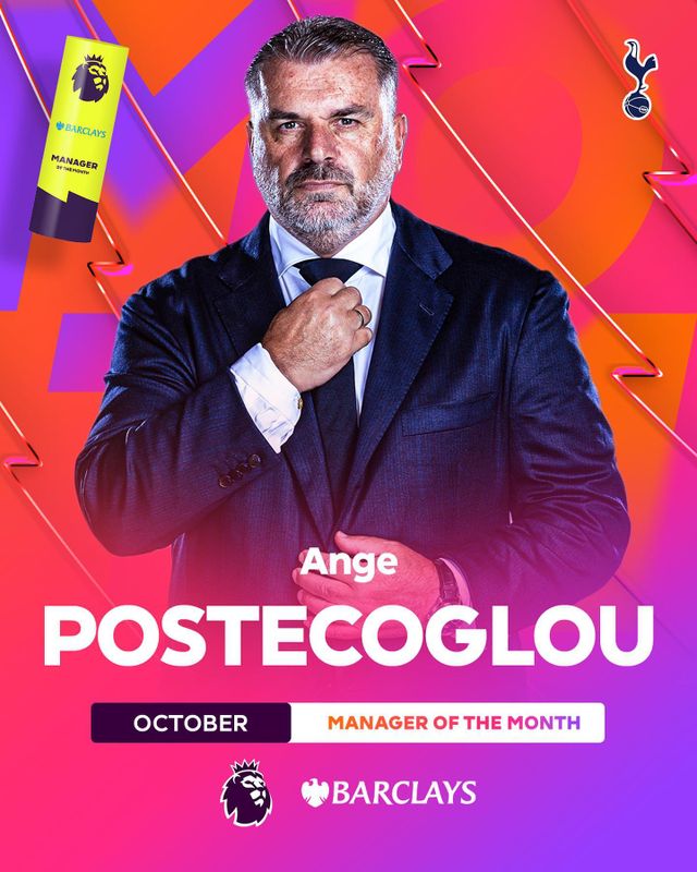 포스테코글루 감독은 지난 8월과 9월에 이어 10월에도 이달의 감독상을 거머쥐면서 프리미어리그 역사를 새로 썼다. 프리미어리그는 "포스테코글루는 3연속 수상 이후 역사를 만들었다. 그는 자신이 받을 수 있는 처음 3개의 이달의 감독상을 모두 수상한 최초의 감독이 됐다"라며 "프리미어리그에서 첫 시즌을 시작할 때부터 3개의 상을 받은 최초의 감독이 됐다. 3달 연속 상을 받은 감독도 단 3명뿐"이라고 전했다.