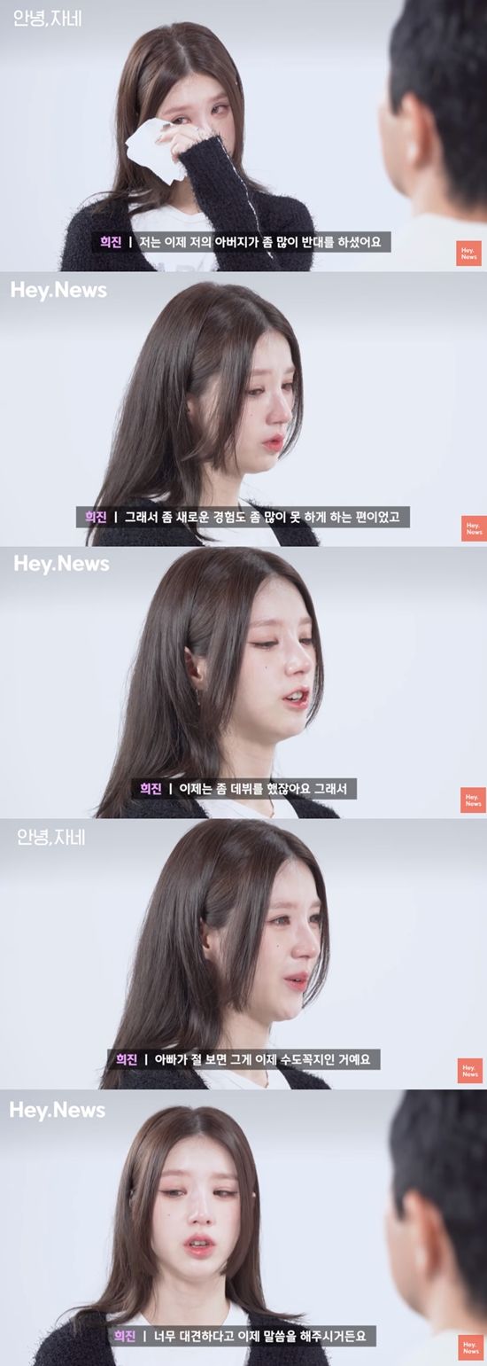 17살 데뷔해 어느덧 데뷔 7년차를 맞이한 희진은 '경험'에 관한 이야기를 나누던 중 "저희 아버지가 (아이돌이 되는 걸) 반대를 많이 하셨다. 새로운 경험을 좀 못 하게 하는 편이다. 항상 일반적인 길을 걸어갔으면 좋겠다고 하셨다"며 울컥했다.