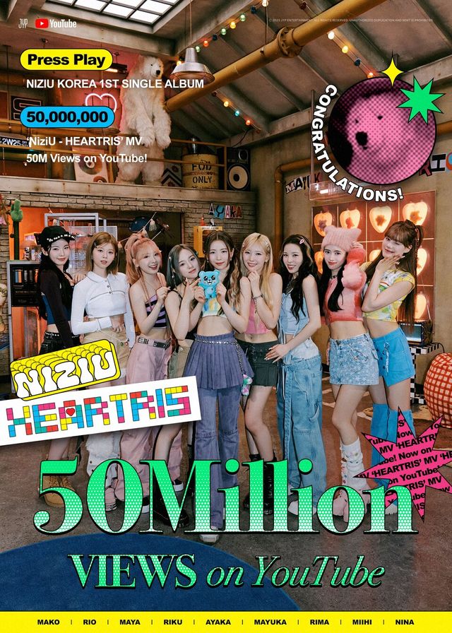 JYP엔터테인먼트(이하 JYP) 소속 걸그룹 NiziU(니쥬)의 한국 데뷔곡 'HEARTRIS(하트리스)' 뮤직비디오가 유튜브 5천만 뷰를 돌파했다.