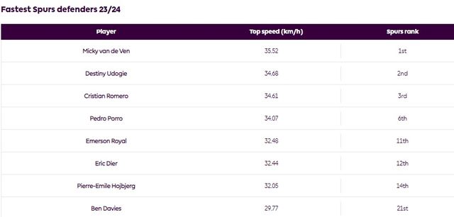 프리미어리그도 토트넘 주전 수비수 3명이 빠진 건 큰 타격이라고 설명했다. 이에 대한 근거로 그들은 토트넘 수비수들의 최고 속력을 계산했다. 올시즌 토트넘에서 가장 빠른 선수는 판더펜(35.52km/h)으로, 그 뒤를 우도기(34.68km/h)와 로메로(34.61km/h)가 이으면서 토트넘 수비수 3인방이 팀 내 스피드 1~3위를 모두 차지했다.