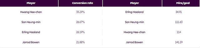 올시즌 황희찬의 골 전환율은 무려 35.29%. 2위 손흥민(26.67%)을 큰 차이로 따돌리고 1위를 차지했다. 전시즌 득점왕 홀란(26.19%)이 3위를 차지했고, 보언(21.88%)이 4위에 올랐다.