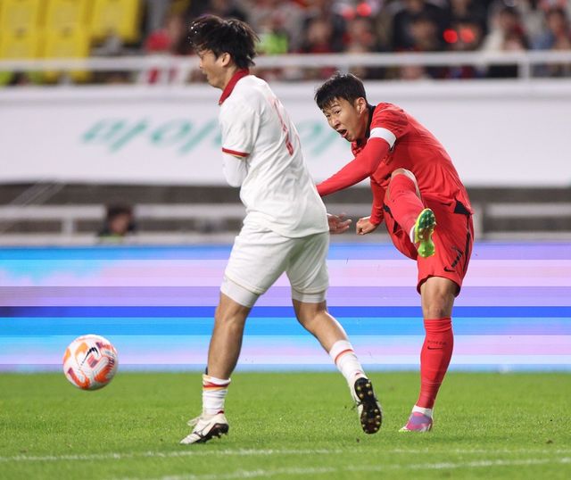 손흥민이 지난달 17일 경기도 수원월드컵경기장에서 열린 축구대표팀 한국과 베트남의 친선경기에서 측면 전환을 위해 패스하고 있다. / 연합뉴스