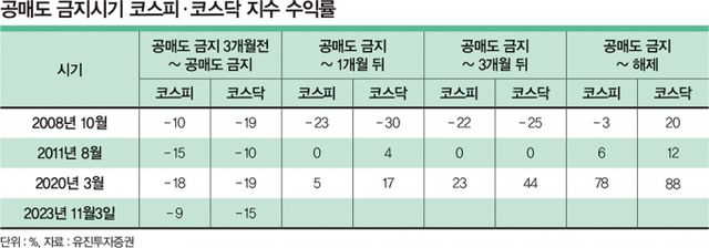 2008년 금융위기 당시는 공매도 금지 이후에도 1개월, 3개월 뒤 코스피는 23%, 22%씩 하락했다. 2011년 8월 공매도 금지 조치가 시행된 1개월 뒤 코스피의 지수 변화율은 없었고 공매도가 해제될 때까지는 총 6% 올랐다.