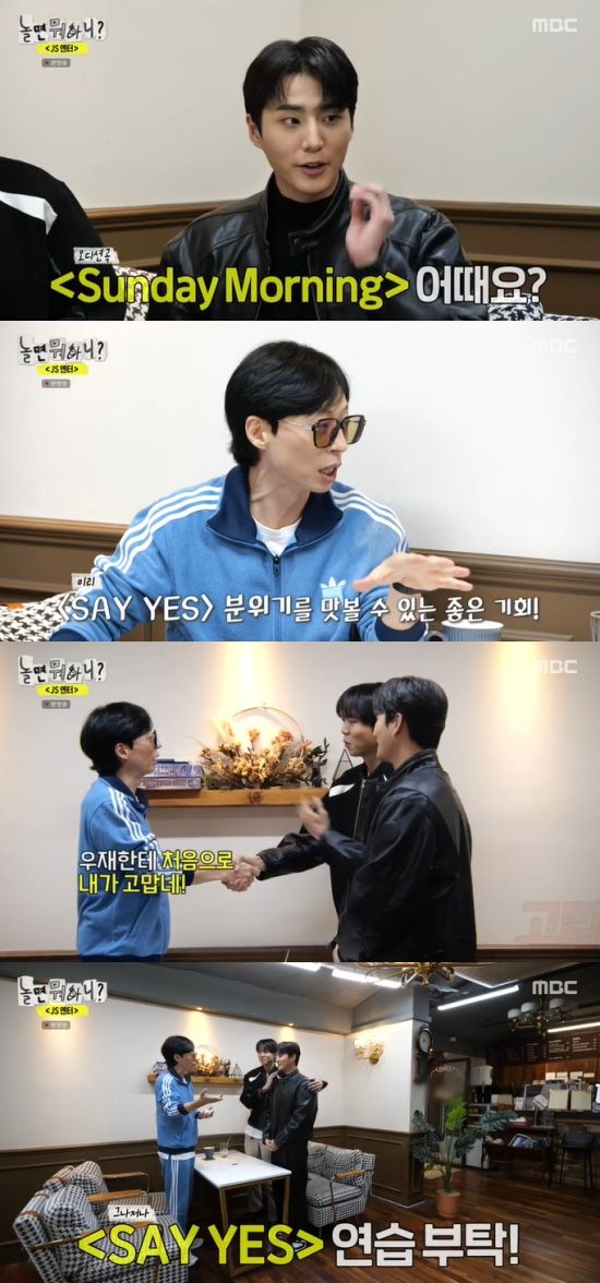 유재석은 "제일 중요한 건 우리 'SAY YES(세이 예스)'의 메인 보컬 목소리가 붙느냐 안 붙느냐다"라며 제안했고, 영케이는 즉석에서 'SAY YES(세이 예스)'를 열창했다. 유재석은 "가이드 직접 부른 거냐. 똑같다. 너무 찰떡이다. 이거 길게 이야기할 필요 있나? 우재한테 처음으로 고맙네. 이거 연습을 해달라"라며 확정했다.