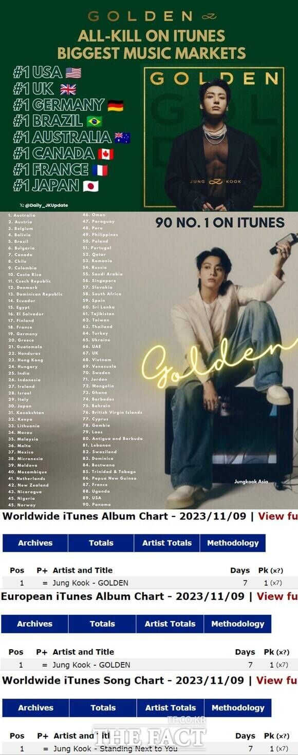 지난 3일 정국이 발매한 솔로 앨범 'GOLDEN'이 글로벌 음원 플랫폼 아이튠즈에서 8대 음원 시장 1위를 제패했다.
