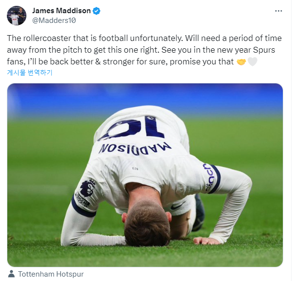 이런 상황에서 매디슨이 SNS에 글을 올려 팬들을 안심시켰다. 매디슨은 "불행하게도 축구는 롤러코스터와 같다. 제대로 회복하려면 당분간 경기장에서 떨어져 있어야 할 필요가 있다"라면서 "난 꼭 더 나아져서, 더 강해져서 돌아오겠다. 약속드린다"고 밝혔다. 그러면서 "내년에 봐요 토트넘 팬 여러분"이라고 2024년에 돌아올 것을 약속했다.