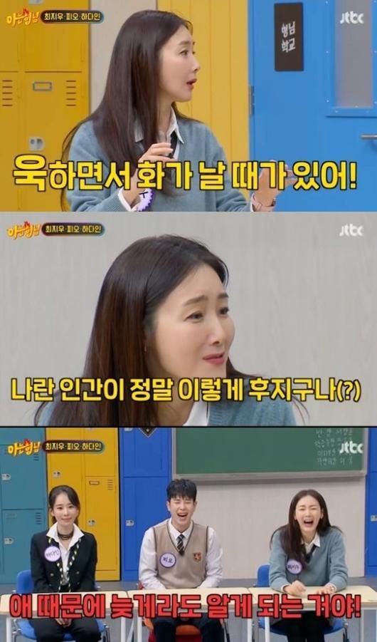 최지우는 "나란 인간이 인성이 되게 후지구나"라고 말하자, 이수근은 "애 때문에 늦게라도 알게 되는 거다"라고 농담을 해 폭소를 유발했다. 최지우는 "반성을 하면서 아이와 함께 성장하고 있다"고 말했다.