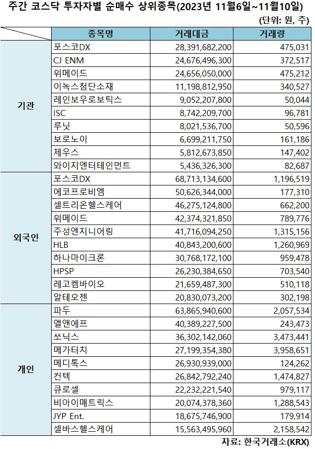기관 '포스코DX'·외인 '포스코DX'·개인 '파두' 1위 [주간 코스닥 순매수- 11월6일~11월10일]