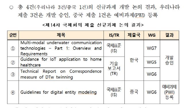 우리나라는2016년 SC 41 설립부터 국제 간사국으로 사물인터넷과 디지털 트윈의 국제표준화를 주도하고 있으며, 이번 회의에서 우리나라는 3건의 표준화 과제를 제안하여 신규 승인됐다.