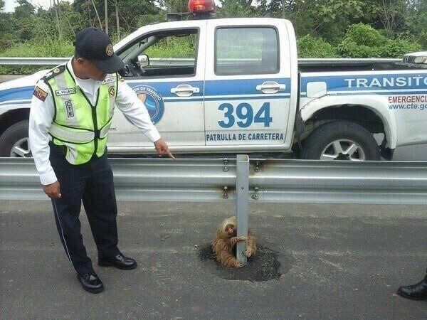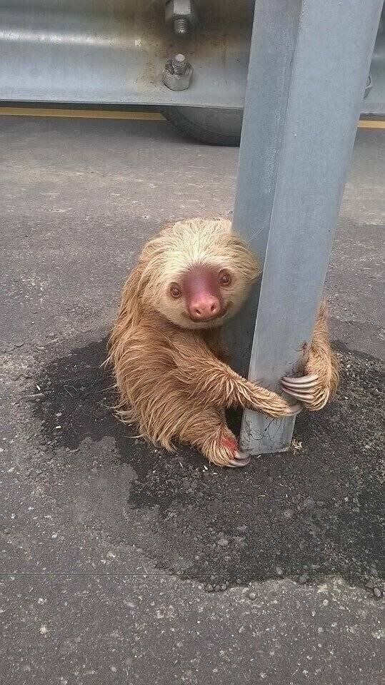 차들이 너무 무서웠는지 가드레일을 꼭 안고 있다 구출된 귀여운 나무늘보.