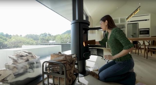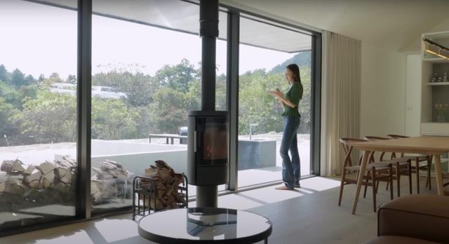 탁 트인 통창으로 홍천의 자연을 조망할 수 있는 거실입니다. 따뜻한 분위기를 연출하기 위해 우드 소재를 적극 활용했는데요, 포인트로 창틀과 조명, 커피 테이블을 블랙 컬러로 선택해 모던한 터치를 더했어요. 거실의 핵심 아이템인 난로는 창문 앞에 두어 바깥 풍경을 감상하며 불멍을 할 수 있어요.