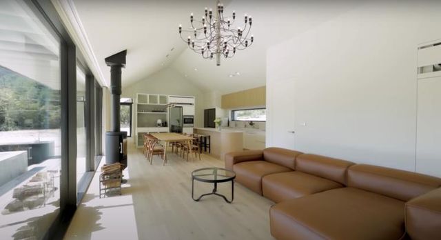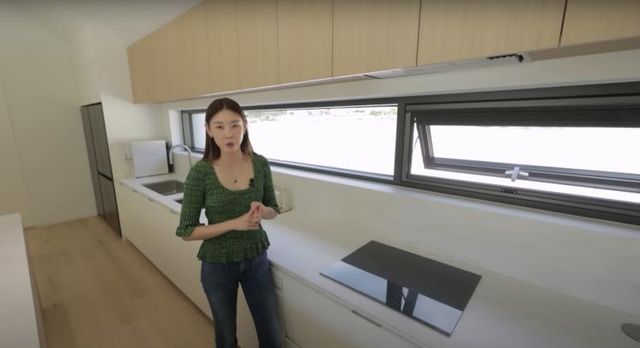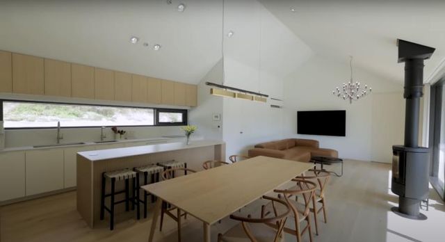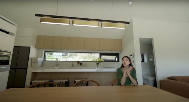 부엌에 있을 때도 뷰를 감상할 수 있도록 조리대 앞에 좁은 창을 냈어요. 덕분에 시시각각 변하는 자연을 감상하며 요리와 설거지를 할 수 있게 되었죠. 부엌과 거실의 경계가 명확하게 구분되지 않은 구조인데요, 부엌 중앙에 커다란 원목 식탁을 두어 모든 공간이 조화롭게 어우러지도록 했어요.