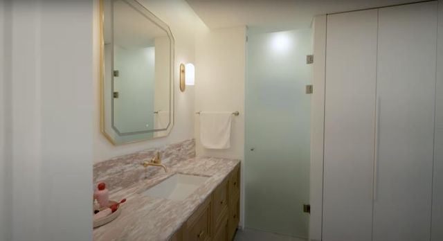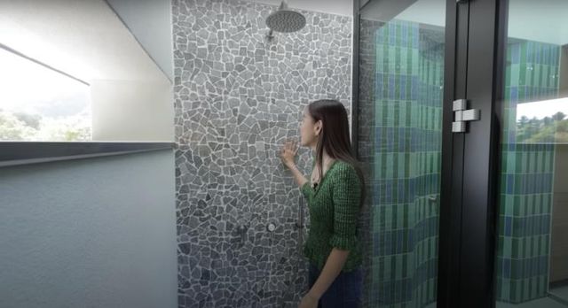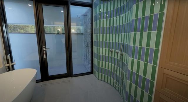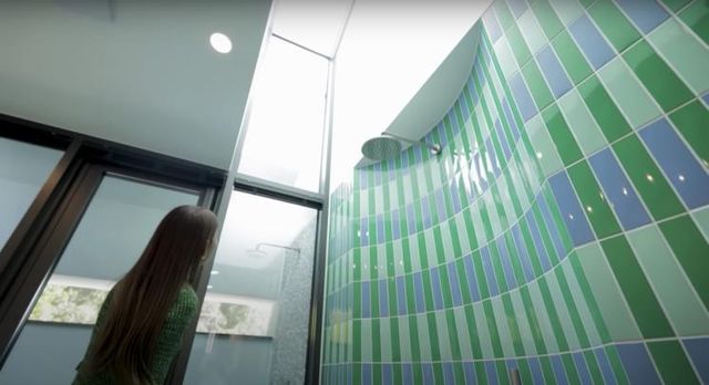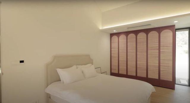 다음으로는 침실을 소개했어요. 화사하고 차분한 공간에 핑크 컬러의 옷장을 두어 밋밋할 수 있는 화이트 톤 인테리어에 포인트를 더했어요. 층고가 높고 자연광이 풍부하게 도는 침실 옆 욕실은 그린 톤의 타일을 사용해 트로피컬 분위기를 연출했어요. 더운 여름엔 야외에서 샤워를 즐길 수 있도록 욕실 테라스에도 샤워기를 설치해 두었어요.