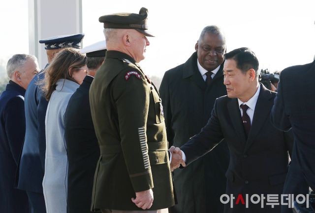 신원식 국방부 장관과 로이드 오스틴 미국 국방장관이 13일 오전 서울 용산구 국방부 연병장에서 열린 제55차 SCM(한미안보협의회의) 의장행사에 참석해 미국 대표단과 인사를 나누고 있다. <사진공동취재단> 단 사진공동취재단>