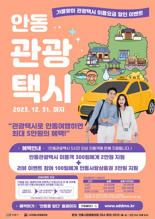 (사)안동시관광협의회는 풍성한 가을을 축하하는 안동관광택시 할인 이벤트를 진행 중이다. 지난 10월 1일부터 오는 12월 31일까지 3개월간 진행하는 이번 할인 이벤트는 안동을 찾은 관광객들이 안동관광택시를 이용하여 보다 쉽고 편리하게 안동의 명소들을 돌아볼 수 있는 놓치기 아까운 기회. 이번 이벤트 기간 내에 안동관광택시를 이용하면 최대 5만원의 혜택이 제공된다. 이벤트 대상은 최소 5시간 이상 이용하는 팀으로, 선착순 300팀에 현금 2만원이 지원된다. 관광택시 신청 후 기사님에게 입금 시 2만원 할인된 가격으로 입금하면 된다. 또한 300팀 중 리뷰 이벤트에 참여한 100팀에게는 안동 곳곳에서 현금처럼 사용 가능한 안동사랑상품권 3만원이 추가로 지급된다.