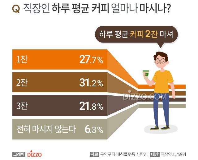 특히 직장인들은 1일 1잔의 커피를 넘어 평균 2잔의 커피를 마시고 있는 것으로 조사됐다. 이들은 하루 평균 4천원대 커피를 마시고, 월평균 약 12만원을 커피값으로 지출하는 것으로 나타났다.