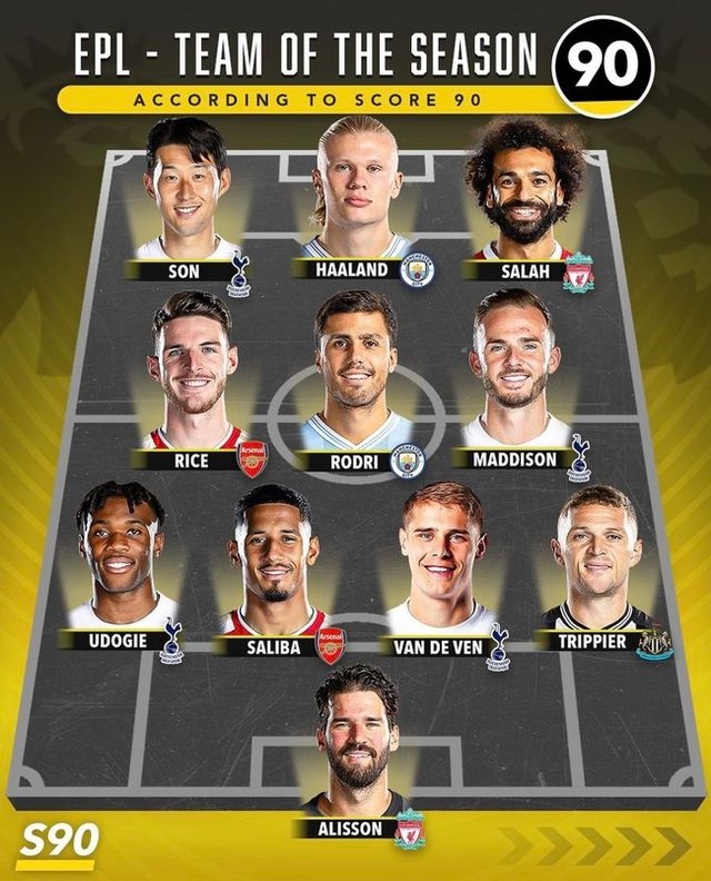 중원 3명은 데클란 라이스(아스널), 로드리(맨체스터 시티), 제임스 메디슨(토트넘 훗스퍼)가 선정됐다. 4백은 데스티니 우도지(토트넘 훗스퍼), 윌리엄 살리바(아스널), 미키 판 더 펜(토트넘 훗스퍼), 키어런 트리피어(뉴캐슬 유나이티드)가 호흡을 맞췄고, 골키퍼 장갑은 알리송 베커(리버풀)가 꼈다.