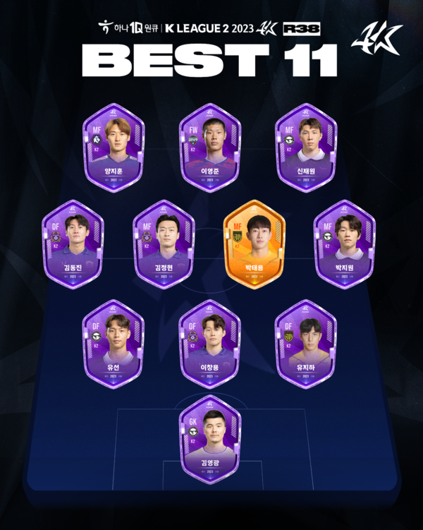 K리그2 38라운드 베스트11을 가장 많이 배출한 팀은 성남FC였다. 서울이랜드를 2-0으로 꺾어 신재원, 박지원, 유선, 김영광 등 4명이 선정됐다. 뒤이어 김동진, 김정현, 이창용 등 안양 선수가 3명이 이름을 올렸다. 그밖에 박태용, 유지하(이상 전남), 양지훈(충북청주FC), 이영준(김천상무)가 영예를 안았다.