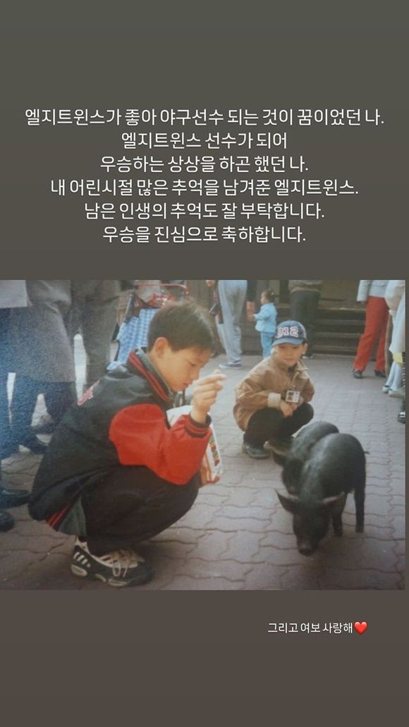 배우 윤박은 "LG 트윈스가 좋아 야구선수가 되는 것이 꿈이었던 나. LG 트윈스 선수가 돼 우승하는 상상을 하곤 했던 나. 내 어린 시절 많은 추억을 남겨준 LG 트윈스. 남은 인생의 추억도 잘 부탁합니다. 우승을 진심으로 축하합니다"며 진심 가득한 글을 남겼다. 함께 공개된 사진 속에는 LG 트윈스 유니폼을 입고 있는 어린 윤박의 모습이 담겼다.