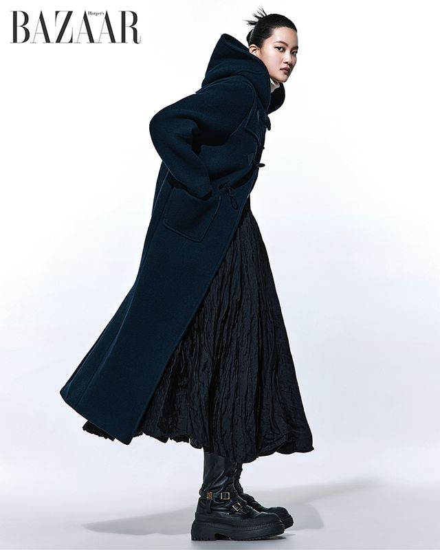 더플 코트는 Prada. 터틀넥 톱은 11만원대 Kume. 플레어스커트는 Dior. 부츠는 2백만원대 Fendi.