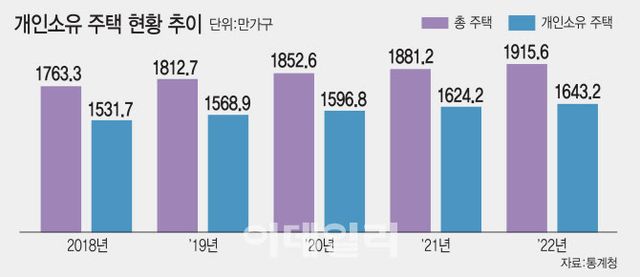 14일 통계청이 발표한 ‘2022년 주택소유통계’에 따르면 지난해 총 주택 수는 1914만6000호로 1년 전보다 19만호(1.2%) 증가했다. 반면 이중 개인이 소유한 주택은 1643만2000호로 85.8%를 차지해 2021년(86.3%)보다 비중이 줄었다.
