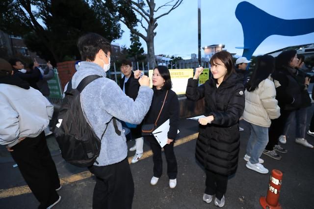 16日,韩国2024年度大学修学能力考试(高考)拉开大幕,今年共有50.4588万名考生参加。图为济州第一高中门前,考生正在奔赴考场。