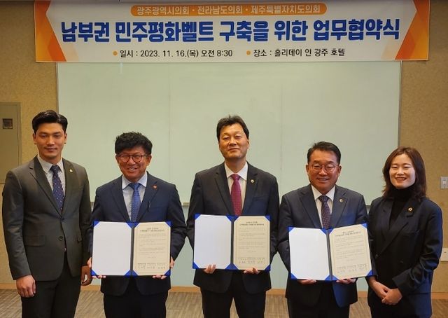 [파이낸셜경제=김윤정 기자] 제주특별자치도의회 김경학 의장은 11월 16일 광주광역시 홀리데이 인 광주 호텔 행사장에서 개최된‘남부권 시도의회 민주평화벨트 구축 협약식’에 참석, 광주광역시의회 정무창 의장, 전라남도의회 서동욱 의장과 함께 업무 협약을 체결했다.