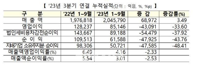 16일 한국거래소와 코스닥협회가 발표한 ‘2023사업연도 3분기 실적현황’ 자료에 따르면 12월 결산법은 1259사 중 분석이 부적합한 법인을 제외한 1112사의 3분기누적 연결 영업이익은 8조5146억원으로 전년 동기 대비 33.60% 감소한 것으로 나타났다. 같은 기간 매출액은 204조5790억원으로 3.49% 늘었고, 순이익은 6조1588억원으로 43.76% 줄었다.