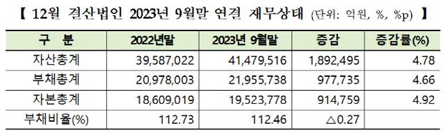16일 한국거래소에 따르면 12월 결산법인 694사 중 분석제외법인 81사를 제외한 613곳을 분석한 결과 3분기 말 연결기준 부채비율은 2022년 말 대비 0.27%포인트 감소한 112.46%로 집계됐다.