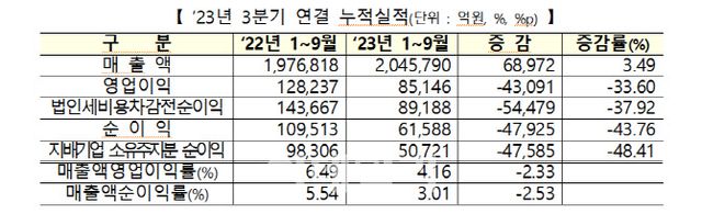 개별·별도 기준 실적으로도 매출액영업이익률과 순이익률이 전년 대비 하락세를 나타냈다. 3분기 누적 개별·별도 기준 매출액영업이익률은 4.5%로 전년(7.5%)보다 3.0%포인트 내렸다. 같은 기간 순이익률은 7.7%에서 4.4%로 3.3%포인트 하락했다.