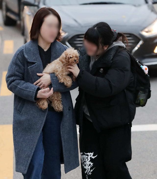 2024학년도 대학수학능력시험일인 16일 오전 서울교육청 제12시험지구 제17시험장인 마포구 서울여자고등학교 앞에서 한 수험생이 어머니, 반려견과 인사를 나누고 있다. / 뉴스1