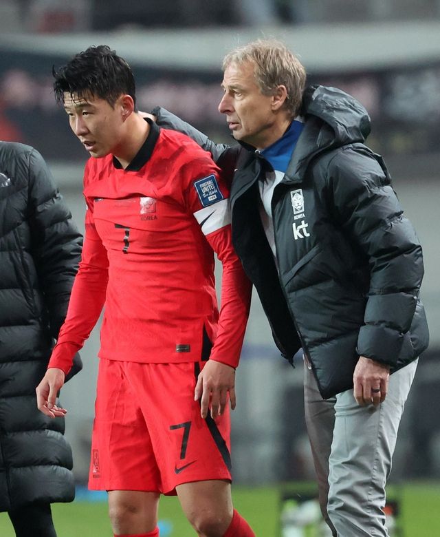 클린스만 감독이 16일 서울 마포구 서울월드컵경기장에서 열린 2026 FIFA 북중미 월드컵 아시아 지역 2차 예선 C조 조별리그 대한민국과 싱가포르의 경기에서 발목 통증을 호소한 손흥민과 대화하고 있다. / 뉴스1