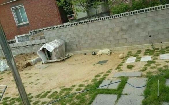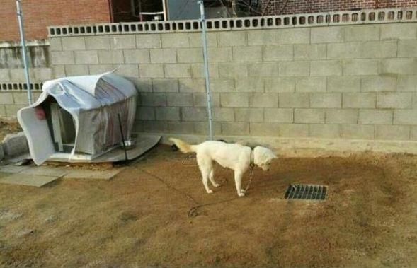 사진 속 진돗개는 시무룩한 표정으로 하염없이 개 집 앞 하수구를 쳐다보고 있다