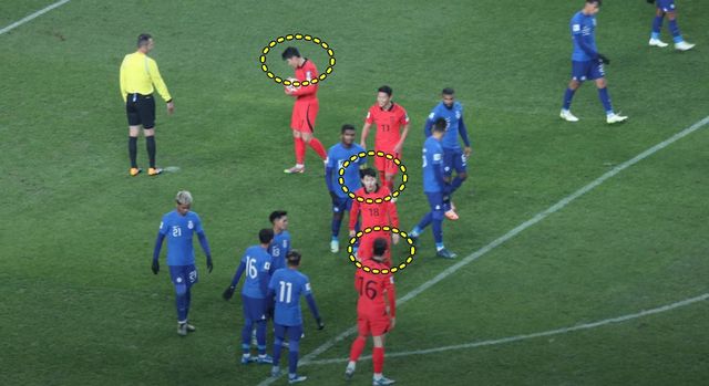 주심 페널티킥 선언과 함께 주장이자 1번 키커인 손흥민이 공을 들고 찰 곳으로 걸어갔다. 손흥민은 주심에게 페널티킥 유의사항 등을 전해 들으며 찰 준비를 했다. 이를 뒤에서 지켜보던 이강인은 멀리 있던 황의조를 쳐다보며 어떤 말을 외쳤다.