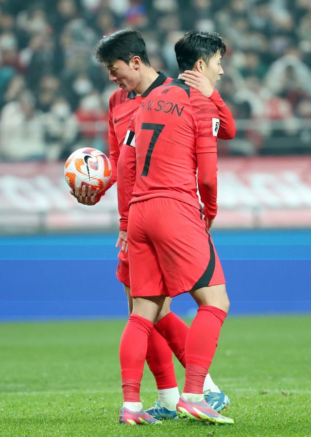 대한민국 축구대표팀 황의조가 지난 16일 서울 마포구 서울월드컵경기장에서 열린 2026 FIFA 북중미 월드컵 아시아 지역 2차 예선 C조 조별리그 대한민국과 싱가포르의 경기에서 손흥민에게 페널티 킥을 양보 받고 있다. / 뉴스1