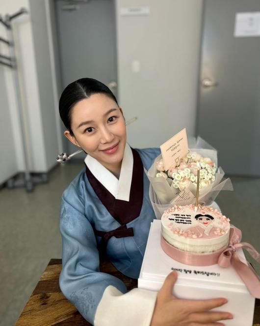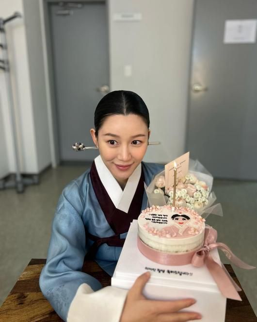 공개된 사진 속 이다인은 극중 의상인 한복을 입고 케이크를 앞에 두고 환한 미소를 짓고 있다. 단아한 미모가 눈길을 끈다.